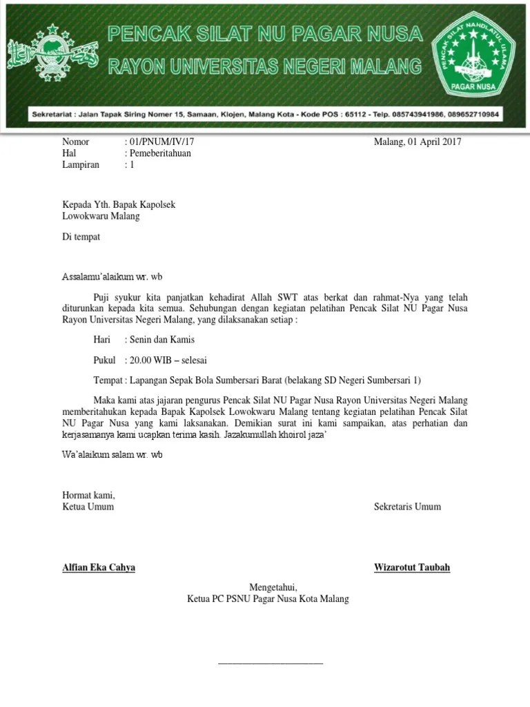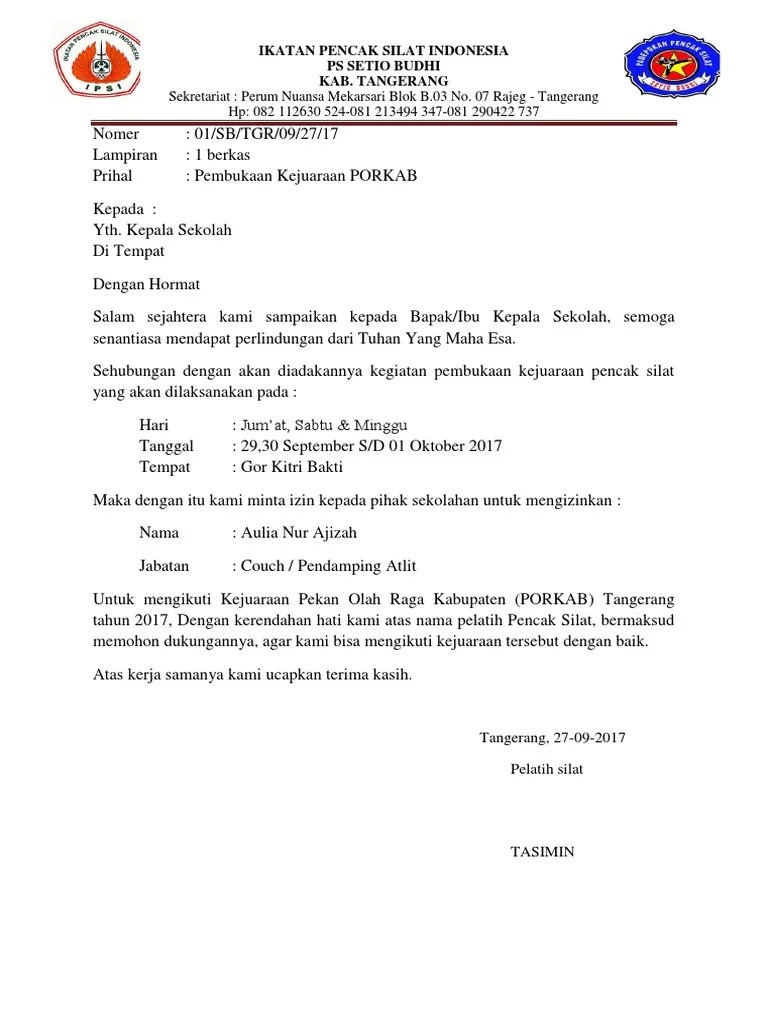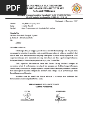 22 Surat Izin Latihan Psht Pics from lookaside.fbsbx.com Salam dan shalawat tidak lupa dipanjatkan untuk nabi besar muhammad saw. Surat permohonan biasanya dipakai oleh seseorang, organisasi, instansi, atau badan usaha untuk mengajukan suatu permohonan secara formal kepada pihak lain. Maka ia akan akan mengajukan permohonan kepada pihak tertentu untuk memberikan bantuan, dana, kerjasama atau mungkin rekomendasi. Contoh surat permohonan latihan gabungan pramuka. Surat permohonan izin membuka unit latihan. Surat permohonan yaitu surat permintaan terkait suatu hal kepada pihak lain yang dibutuhkan. Dalam mengadakan sebuah acara baik itu rapat, pelatihan, seminar, kegiatan knpi dan hmi biasanya akan membutuhkan tempat yang mampu. Sebagai seseorang yang hidup bersama di dalam sebuah masyarakat tentu akan dihadapkan pada berbagai masalah yang melibatkan individu dengan orang lain.